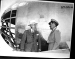 Amon Carter in front of the "City of Fort Worth" with General Roger M. Ramey. General Ramey is standing sideways facing Amon Carter while Amon Carter looks sideways at him. Mr. Carter is wearing a suit tie and hat while General Ramey is in his military uniform.