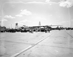 Shot of crowd around the B-36 which was dedicated as "City of Fort Worth." The airplane is pictured with people walking around and some vehicles present.