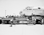 Crowd shot. A view of the plane dedicated as the "City of Fort Worth," a B-36. Mr. Carter and General Ramey are standing in front of the plane with people observing them. Some people are seated while others are standing behind a line. There is a man recording the event.