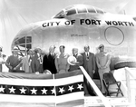 Crowd shot. Amon Carter and General Ramey standing with other unidentified people in front of the airplane. Some of the men are wearing Military uniform while others are wearing suit and tie.