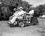 Riding a golf "fairway buggy" are (from left) C. W. Reed, Johnny Ballard and Hughes King. At the controls is owner Marvin Leonard.