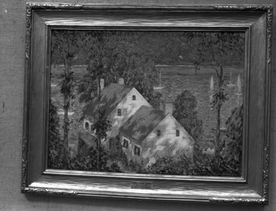 Painting. "Cold Springs Harbor," an oil painting by Eliot C. Clark. Seen in the painting are trees, houses, grasses.