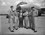 RAF Fliers touring Convair. Left to right, Squadron Leader C. K. Saxelby, Wing Commander G. D. Milne, Walter Barling, Convair procurement engineer; Group Captain W. P. J. Thomson, leader of the RAF flight; Colonel Raymond F; Rudell, USAF liaison officer, Washington, and Squadron Leader Alastair G. Lang.