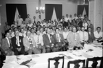 Entire group. A group photograph of the men present at the International Mailers Union Convention. They are seated in rows with some men standing at the back. In front of them, there is a table with documents, cups and a jug. In the background, there are windows with blinds and curtains.