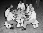 Mr. Amon Carter, right, foreground at table with group. Mr., Carter is sitting outdoors on a bench at a table with a group of unidentified men. They have food and drinks in front of them and they are all looking towards the camera and smiling .