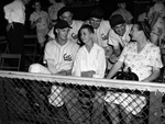 Johnny Morrison, 14, and grandmother, Mrs. Bob Riley, with Clarence Podbielan (front row) and Gene Costello, Robert Austin and Roy Schalk at a Fort Worth Cats baseball game.