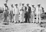 Left to right, Joseph R. Pelich, architect; Show officials J. M. North Junior; Edgar Deem , Amon Carter, Ernest Allen and C. Milo Thelin and W. R. Watt. They are all wearing suit and ties with hats and are standing in a row facing the camera and smiling. Mr. Carter is standing in the middle with a shovel on his shoulder. They are standing outdoors at the Southwestern Exposition and Fat Stock Show buildings groundbreaking ceremonies. In the background, there is a partial view of vehicles.