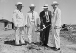 Edgar Deen, Watt, Allen and Carter. .The men are standing in a row and Mr. Allen lifts up a shovel filled with sand at the Southwestern Exposition and Fat Stock Show buildings groundbreaking ceremonies. They are all wearing suit and ties with hats and are standing in a row with most of them looking towards the camera except Mr. Deen, who is looking straight on as he stands sideways. .