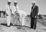 Carter, Watt Dean, and Allen. The men are watching as Mr. Deen bends while picking up sand and bricks from the ground using a shovel at the Southwestern Exposition and Fat Stock Show buildings groundbreaking ceremonies. They are all wearing suit and ties with hats