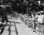 Happy birthday Queen Tut. Queen Tut, zoo elephant obligingly receives offerings of bread and peanuts from her public Sunday, when an open house was held at Forest Park Zoo in honor of her 28th birthday. Penny, her undersized stablemate, wistfully thrusts out her trunk for a share of the day's proceeds. Photograph of two elephants in their enclosure, A crowd of people are standing in front of the enclosure feeding the elephants. Published in The Fort Worth Star-Telegram Morning Edition September 08, 1947.