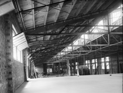 Interior look into one of the many buildings that makes up the Fort Worth Industry. The building interior is made up of a metal structure with lots of room and a few machines. Published in Fort Worth Star-Telegram evening edition August 20, 1940.