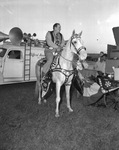 Sid Richardson, not wearing a hat, on horseback at Amon Carter's Shady Oak ranch near Azle, Texas; van and loud speakers on roof behind him, 09/13/1947