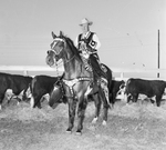W. R. Watt, stock show president , on horse. Mr. Watt is seated on a horse holding the lead. He is wearing a long sleeve collared shirt with a vest and cow boy boots. In the background, there are steers.