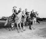 Left to right, Fort Worth Mayor F. Edgar Deen, Ernest Allen, W. R. Watt and Sid W. Richardson. The men are sitting on horses and are lined up in a row. They are wearing similar long sleeve collared shirts with vests and hats. There are some motor vehicles in the background.