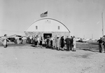 Guest inspecting barns. People in small groups talking and looking around the barn at steers. They are in front of a building with a flag of the United States.