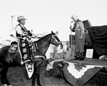 Barbecue at Northwoods Farm. Amon Carter and W. R. Watt. Mr. Carter is standing on a stage and talking using the microphone while Mr. Watt is sitting on a horse across from him. There is another man observing in the background.