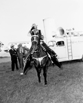 Barbecue at Northwoods Farm. Mr. Watt is sitting on a horse. He is holding the lead of the horse with one hand and has his other hand on his hat. He has his legs spread out wide while seated. In the background, there are some men standing and some people seated watching from an automobile in the background.