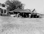 Barbecue at Northwoods Farm. A view of a crowd standing outdoors under a tent. There is a tree and a house in the background