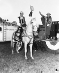 Barbecue at Northwoods Farm. An unidentified man sitting on a horse with a hat in his hand, which is raised up in the air. Amon Carter is standing on the stage and also has his right hand up in the air with a finger pointing out. There is a bus with a ladder in the background and some equipment on stage.