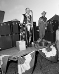 Barbecue at Northwoods Farm. Mr. Watt and Amon Carter are standing on a stage, Mr. Watt is speaking using the microphone. There is a partial view of unidentified man standing on the ground.