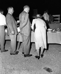 Barbecue at Northwoods Farm. The back and side view of people standing on a queue serving food from a buffet outdoors. There are men and women present
