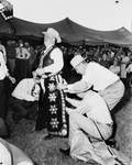 Barbecue at Northwoods Farm. A group of unidentified men putting on chaps and horse riding attire for Mr. Watt while an audience watches. There is also a partial view of someone passing gloves to Mr. Watt.