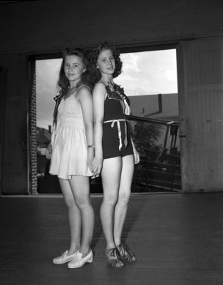 Recreation Department circus. Left to right, Caroline Fuller and Betty Lois McAlroy, winners of health and beauty contest in 14-year old division, seen back to back holding hands.