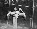 Bird in hand. "Salty", white pelican, a mere palmful when brought to Forest Park Zoo last spring, proves almost too much for Zoo Attendant Clyde Smith to handle. The bird, now five months old, is about a third larger than normal for his age. Photograph of Salty, a white pelican, held by Forest Park Zoo attendant Clyde Smith. Published in The Fort Worth Star-Telegram Morning Edition September 30, 1947.