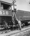 Conductor C.J. Olson gives engineer W.H. Cunningham (on steps) and fireman E.S. Bedford (in cab) the go-ahead order for train to move from Weatherford to Mineral Wells, 10/01/1947