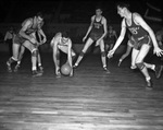 The Texas Christian University Horned Frogs (white jerseys) are hosting the visiting University of Arkansas Razorbacks. The basketball game is being held at Will Rogers Memorial Coliseum Tuesday night. Frog Bob Hendricks is shown stealing the basketball and racing between two of the tallest players in the Southwest Conference. Forward Alvin Williams (16) is 6-6 and center George Kok (10) is 6-10. Arkansas went on to win the game 54-39.