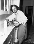 Texas Women's Open tournament golfer Babe Zaharias is photographed cutting a ham.