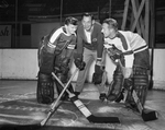 Fort Worth Rangers ice hockey team members Tony Savage (center), new manager of the Rangers, huddles with his two goal tenders Nelson Little (left) and Phil (Red) McAtee.