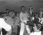 Ted Horn, winner with his trophy, American Automobile Association Championship at Arlington Downs, Arlington. He was born Eylard Theodore Von Horn, was an American racecar driver. He won the AAA National Championship in 1946, 1947 and 1948 and collected 24 wins, 12 second-place finishes and 13 third-place finishes in 71 major American open-wheel races prior to his death at the DuQuoin State Fairgrounds at the age of 38.