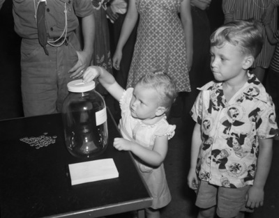 The Forest Park Zoo celebrated the birthday of their elephant, "Queen Tut." Two-and-half year old Phyllis Anita Flanery, stood on her tiptoes to drop twenty-one pennies into a jar. The proceeds went to the baby elephant fund. Phyllis is wearing a dress with ruffles on the sleeves. There is a young boy standing in landing behind her. He is dressed in a button-up shirt and shorts.