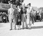 Amon Carter Jr., Margaret Truman, and General and Mrs. Eisenhower, from left to right. They are standing outdoors outside at Shady Oak Farm. They are standing in a row and smiling as they pose for the camera. Mr. Carter is wearing a suit and tie while the general is in his military uniform. The women are wearing suits and skirts with hats. There are other people in the background watching.