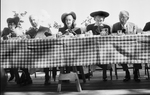 Left to right, Jesse Jones, Houston; Mrs. Electra W. Biggs, Mrs. Oveta Culp Hobby, Houston and Karl Hoblitzelle.They are seated at a table with plates of food and drinks in front of them with some of them eating and others looking towards the camera. In the background there are plants and trees..
