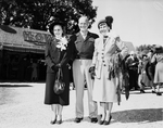 Margaret Truman, left, with General and Mrs. D. D. Eisenhower at Shady Oak Farm. The General is standing in the middle with the women standing on his side. They are outdoors at Shady Oak Farm. The General is in his military uniform while the women are wearing suit and skirts with hats, There are other people in the background and a partial view of a tree.