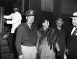 General and Mrs. D. D. Eisenhower and Amon Carter. General Eisenhower and his wife standing outside a train. The general is looking towards the camera while Mrs. Eisenhower is looking sideways talking to Amon Carter . There are two other unidentified men in the background.