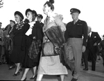 General and Mrs. Dwight D. Eisenhower and Amon Carter. Mrs. Carter, Margaret Truman, General and Mrs. Eisenhower walking with other people in the background.