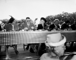 Unveiling of Will Rogers Statue and portrait. Guests at the event including Mrs. Carter seated at a table outdoors with plates of food and drinks in front of them. They are eating and having conversations. There are trees in the background.
