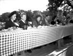 Unveiling of Will Rogers Statue and portrait. Guests at the event seated at a table outdoors with plates of food and drinks in front of them. They are eating and having conversations. There are trees in the background.