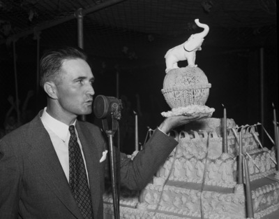 The Forest Park Zoo celebrated the birthday of their elephant, "Queen Tut" and offered free cake to anyone who attended the party. Judge Gilmer of Corporation Court, was the master of ceremonies. He is holding the sugar elephant that topped the birthday cake. The topper was auctioned off to the highest bidder, G. W. Outenreath. The ornament brought $2.50 to the baby elephant fund. Judge Gilmer is standing in front of a microphone, dressed in a tweed suit. Behind him is the cake made by Joe Vasquez, Hotel Texas pastry chef.