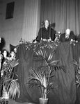 Shots made at unveiling of statue and painting of Will Rogers. An unidentified man standing in front of the microphone talking with his hands at his back. He is wearing a military uniform and beside him to his left is another unidentified man dressed in a suit and tie bending . The table in front of them is decorated with flowers. There is a partial view of people sitting in the audience to the speakers right side.
