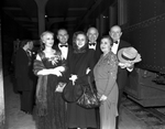 Reception and dinner honoring General and Mrs. D. D. Eisenhower and Margaret Truman. Mrs. Carter, Mr. Carter, and Amon Carter Junior are standing with a group of people. The men are dressed in suits and bow tie while the women are wearing evening gowns.