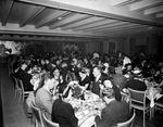 Reception and dinner honoring General and Mrs. D. D. Eisenhower and Margaret Truman. An overview of the guest at the reception dinner. They are wearing formal attires and are seating at rectangular tables with plates of food in front of them.