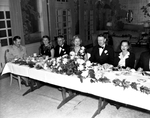 Reception and dinner honoring General and Mrs. D. D. Eisenhower and Margaret Truman. A group of unidentified people are seated at a rectangular table decorated with flowers and leaves. They have food and drink in front of them and are all seated smiling