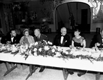 Reception and dinner honoring General and Mrs. D. D. Eisenhower and Margaret Truman. Amon Carter senior and junior with a group of unidentified people are seated at a rectangular table decorated with flowers and leaves. They have food and drink in front of them and are all seated smiling and having conversations