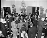 Reception and dinner honoring General and Mrs. D. D. Eisenhower and Margaret Truman. Guests at a dinner party in different small groups standing and having conversations. They are all indoors. In the room, there are wallpapers with trees and a view of nature and a chandelier draping from the ceiling.