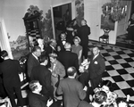 Reception and dinner honoring General and Mrs. D. D. Eisenhower and Margaret Truman. A top view of the guest at the dinner party having conversations and drinks. They are all indoors. In the room, there are wallpapers with trees and a view of nature and a chandelier draping from the ceiling.