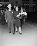 Shots of the unveiling of the statue of Will Rogers. Amon Carter and an unidentified woman holding a flower bouquet in her hands walking together. There are other people walking in the background. Mr. Carter is wearing a suit and tie with hat.